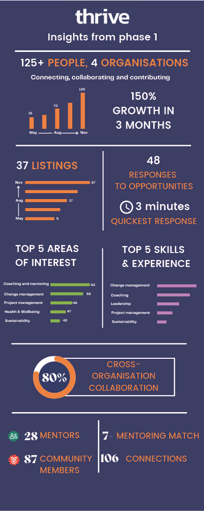 The potential for transformation is huge. To get there, we are deliberatively starting small and building on insights and learnings. The first step is going to be using the THRIVE platform, which gives the participants the ability to activate mentoring, connections and shared events/communities within the ecosystem for agreed employees. In turn, this supports the organisation’s development priorities and Employer Value Proposition. This then starts to build the readiness, connections and networks to unlock opportunities for transformation such as skills pipelines, career pathways and shared talent pooling both within and across the participating organisations.